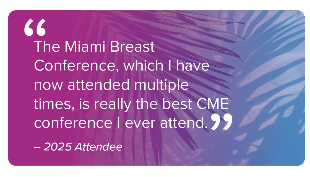 For 42 years, the Miami Breast Cancer Conference® has been the must-attend meeting where surgical, medical, and radiation oncologists, geneticists, pathologists, radiologists, and supportive care experts come together to turn the latest evidence into real-world practice.